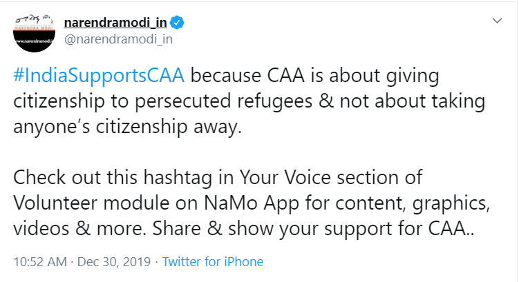 Recently we show a tweet from his account explaining in brief what is CAA. Monday tweet of Prime Minister Narendra Modi on controversial Citizenship Amendment Act was supported by many followers online. PM Modi's tweeter handle also used tag of #IndiaSupportsCAA".