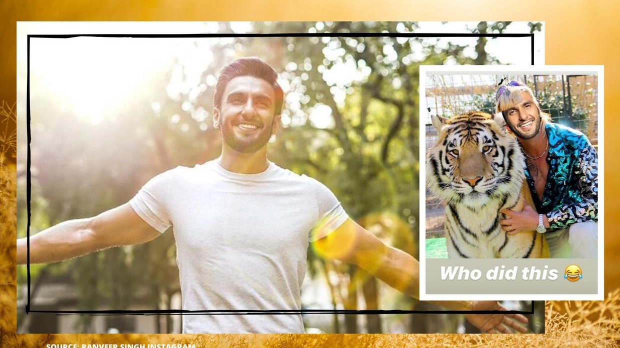 Photo is with a tiger. The picture is of Joe Exotic, which is edited and posted on Ranveer profile for fun. With his post, he captions that "Now who did this?"